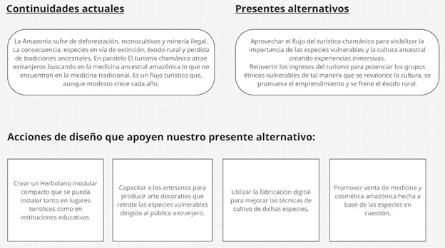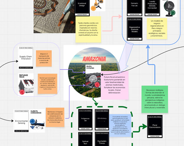 Para la siguiente sesión se nos dio la libertad de descubrir más Áreas de Oportunidad, Señales Débiles y Conceptos detonantes para hacer evolucionar nuestra idea. La Week Signal de Futuros Rurales y me hizo pensar en la Amazonía y las especies endémicas en vías de extinción por la sobreexplotación de recursos. Los siguientes Ramdom Triggers me hicieron pensar en las fortalezas de la cultura amazónica. 1. Tec indígena, 1. Terapia psicodélica, 1. Tec espiritual, 1. Etnobotánica.