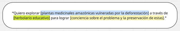 Y luego adoptamos la Perspectiva en 1ra persona (1PP) para convertir el acto de diseñar en algo personal colocando al diseñador en el centro. Mi tema es preservar plantas medicinales en extinción, por ende, abordaría la 1PP desde la experiencia personal. Propongo utilizar algunas de las plantas en cuestión y documentar su efectividad. Algunos ejemplos: