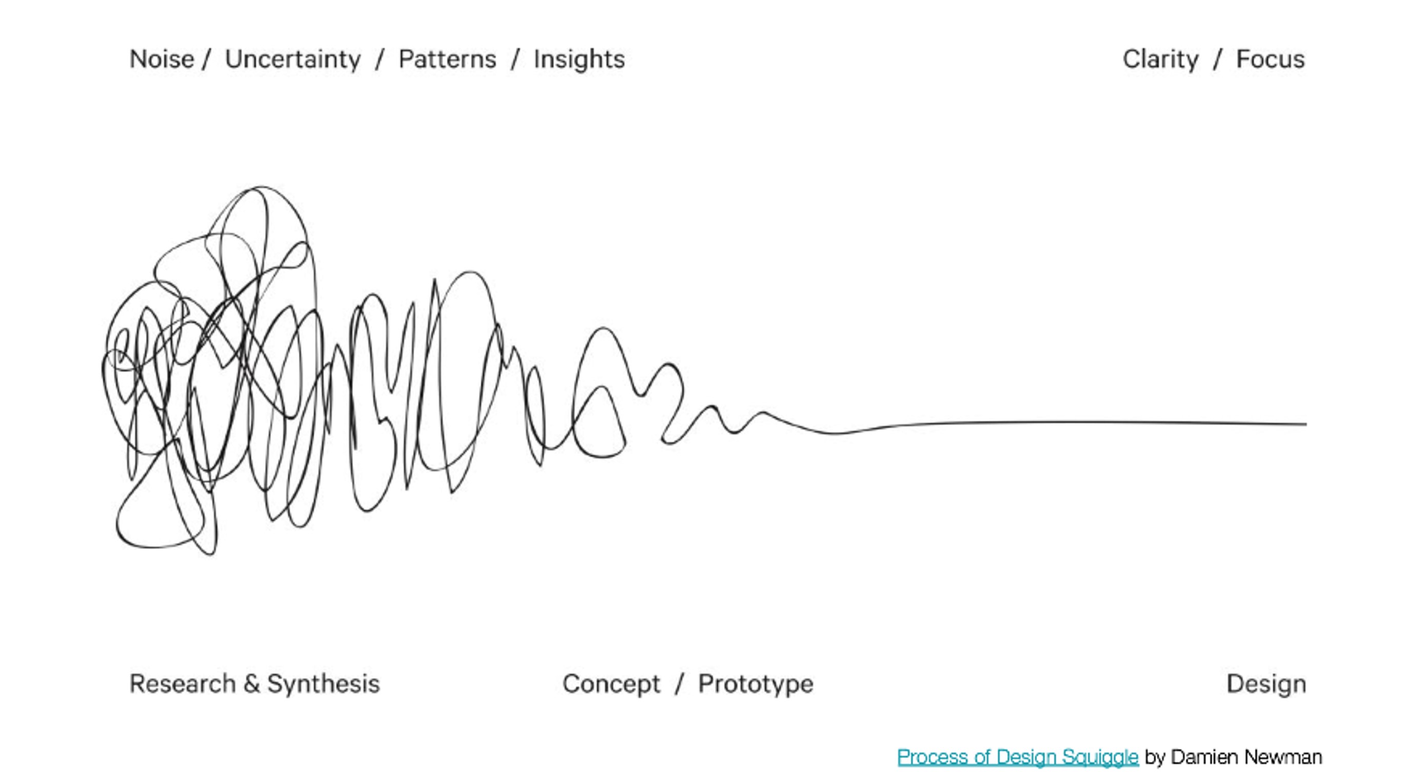 Es un garabato lineal que empieza con un trazo enredado, y poco a poco se va ordenando hasta convertirse en una línea recta. Simboliza cómo los proyectos de diseño, comienzan desordenados, llenos de incertidumbre y exploración, y luego se van clarificando hasta llegar a una solución concreta. Se usa mucho en Design Thinking, para explicar que la confusión inicial es parte natural del camino hacia la claridad. Design Thinking: ‘El pensamiento de diseño es un enfoque centrado en las personas para la innovación, que combina las necesidades humanas, las posibilidades tecnológicas y los requisitos para el éxito’. Tim Brown (IDEO, 2008) Harvard Business Review, “Design Thinking”