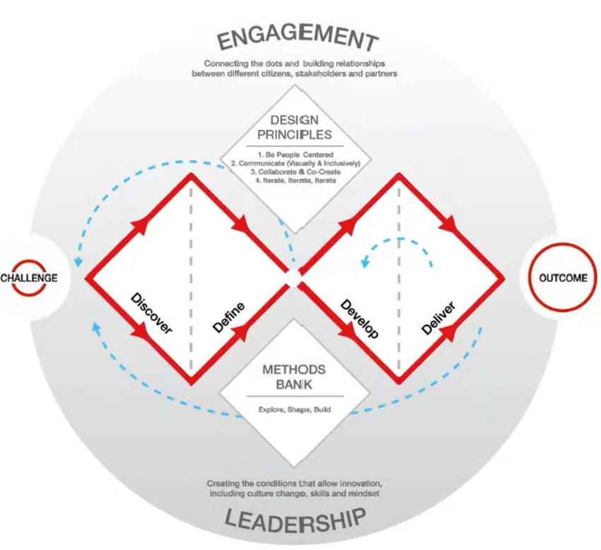 Aprendimos el modelo del Doble Diamante del British Council que es un proceso de diseño que se basa en dos fases de pensamiento divergente y convergente que estructuran el camino desde la comprensión del problema hasta la entrega de soluciones. Además, dentro del marco de innovación, cuando se va en favor de generar innovación social, esto implica otros factores como el compromiso de las comunidades, y que sea sostenible en el tiempo.
