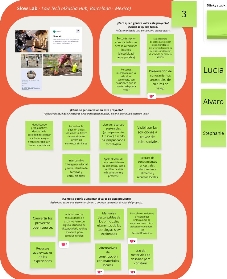 A continuación, los ejercicios prácticos. Hicimos un primer ejercicio grupal para evaluar proyectos existentes que ya trabajan con los principios descritos, en nuestro caso Slow Lab. Luego propuse un proyecto de inspiración que trabaja con innovación abierta y Diseño Distribuido. Finalmente, un ejercicio para asociar los valores del diseño distribuido a mi proyecto.