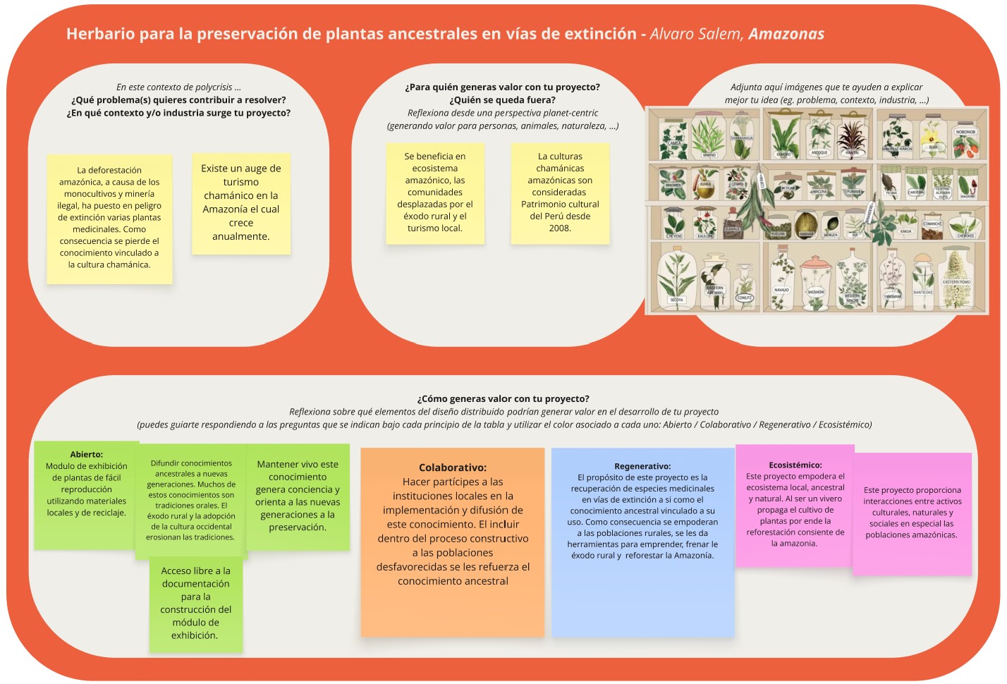 Los principios del Diseño Distribuido me ayudaran a enmarcar los valores del proyecto del Herbario y a darle un mejor alcance: Abierto: Publicar en GitHub el diseño del módulo, los sensores y la narrativa simbólica. Colaborativo: Invitar a artistas Shipibo-Conibo y a botánicos amazónicos para contribuir con el diseño. Regenerativo: Usar materiales reciclados como madera recuperada. Incitar a la población a cultivar biodiversamente. Ecosistémico: regenerar los vínculos entre plantas, saberes ancestrales, comunidades amazónicas y el público general.