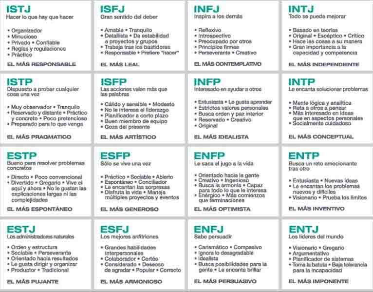 a. Indicador Myer-Briggs Type (MBTI): Este permite definir tu personalidad. Lo importante de definir la personalidad es que es más fácil encontrar perfiles complementarios para futuros negocios.