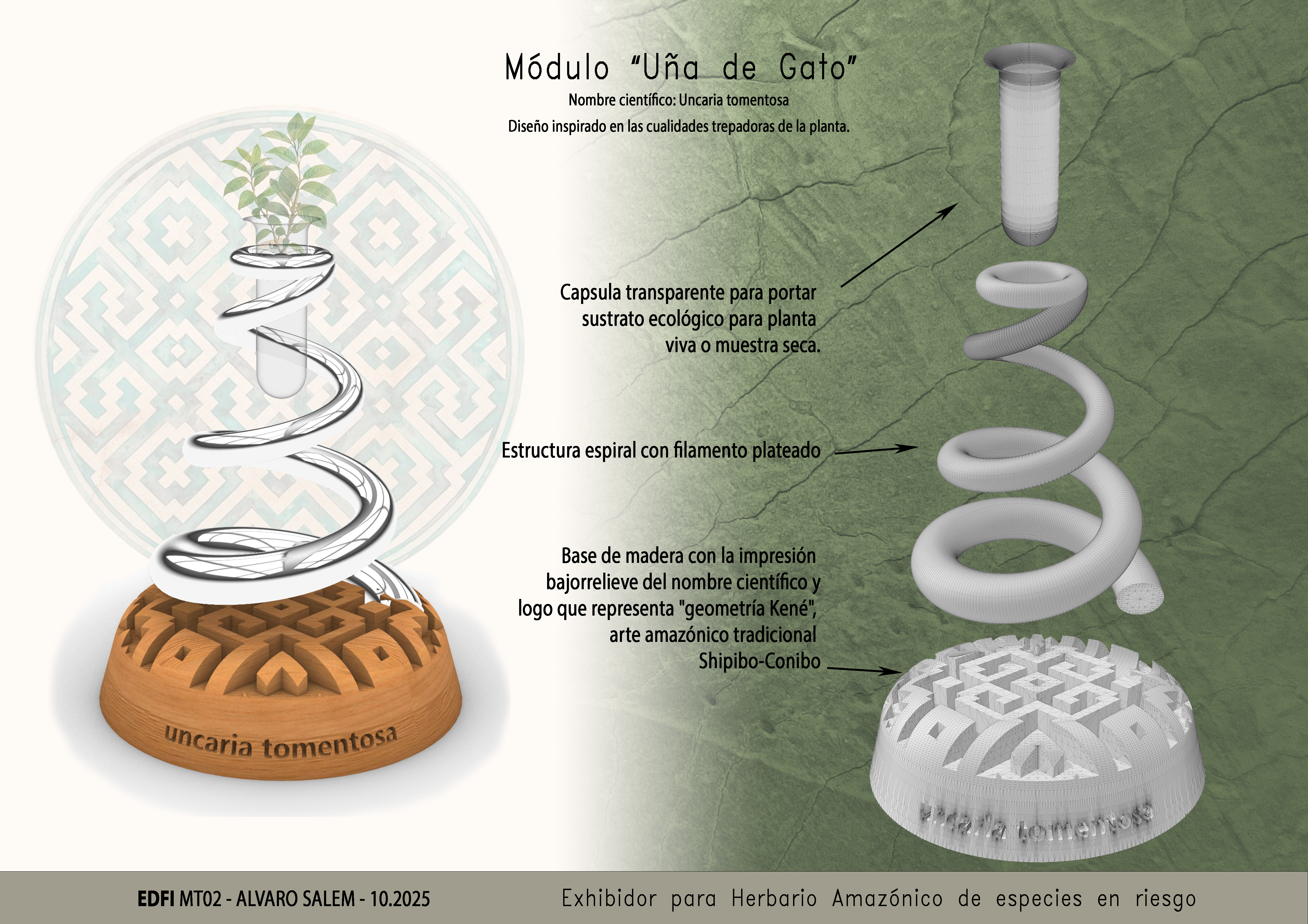 Para el ejercicio opté por crear un objeto vinculado a mi proyecto final: un herbario de plantas amazónicas en riesgo. Se trata de un módulo de exhibición de especies vegetales. En esta etapa desarrollamos maquetas que, más adelante, formarán parte de un elemento interactivo dentro de una exposición sobre diversas especies. En este caso, se trata de un exhibidor dedicado a la planta medicinal Uña de gato.