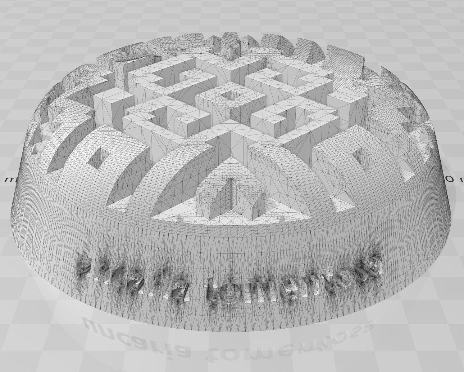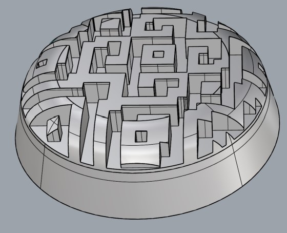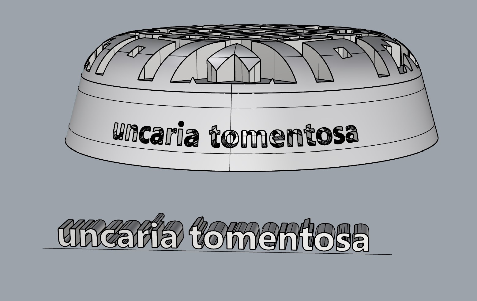 Creé un volumen del nombre científico con el comando Textobjet y lo agrupé. Para poder adosarlo al cono primero generé una círculo de guía en la superficie del cono con Extractisocurve y con Flow lo adapté a la guía. Luego con Boolean Difference lo tallé en bajorrelieve.
